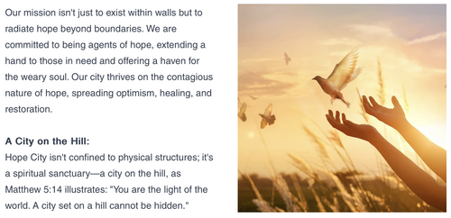 Hope City, true to its name, is called to be a haven of hope, resonating with the timeless truth found in Romans 15:13: "May the God of hope fill you with all joy and peace as you trust in him, so that you may overflow with hope by the power of the Holy Spirit."